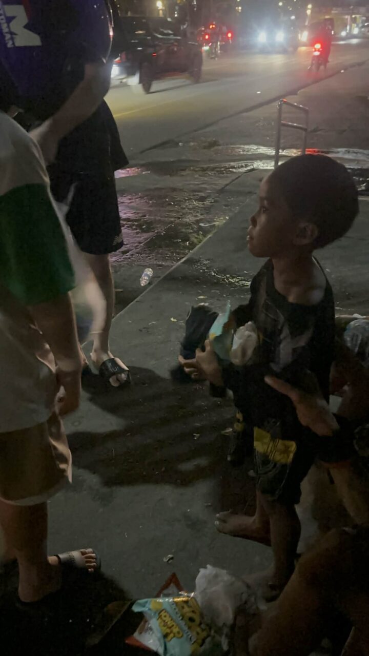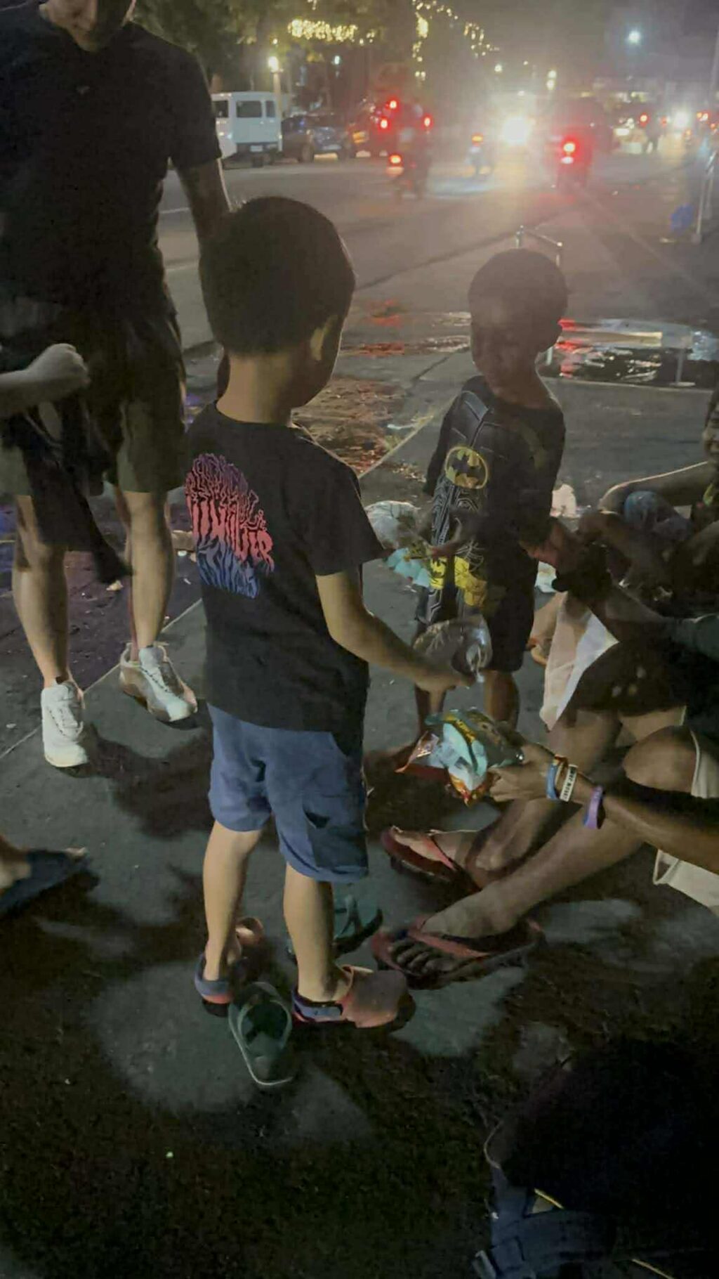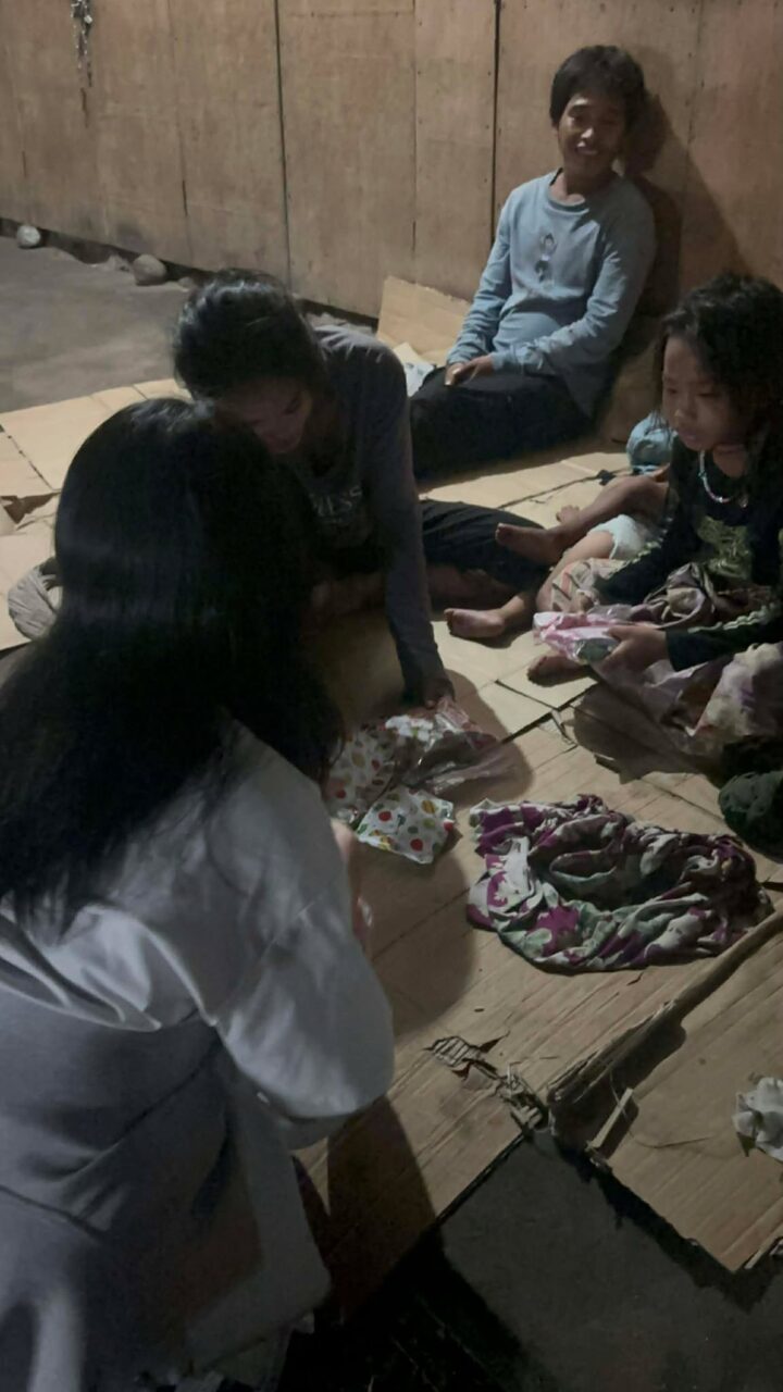 夜9時を過ぎてから、バイクで街を回り、探しながらプレゼントを手渡します。 路上の隅で眠る子どもたち。