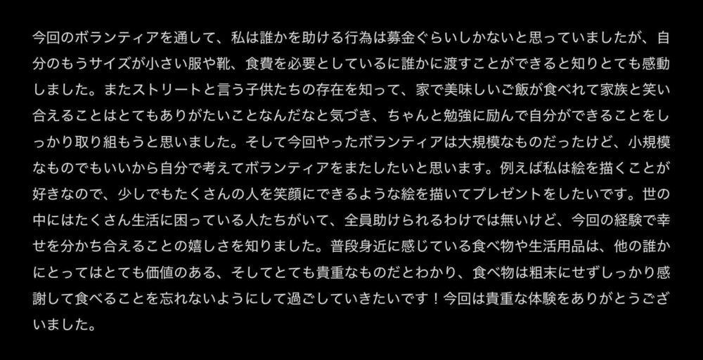はなちゃんの感想文には、そのすべてが詰まっていました。 このクリスマスドネーションは、支援を受け取った人たちだけでなく、 参加した私たち自身の心にも、確かに何かを残してくれました。 はなちゃんのこの経験が、これから先の人生のどこかで、 また誰かの笑顔につながっていくことを、心から願っています。